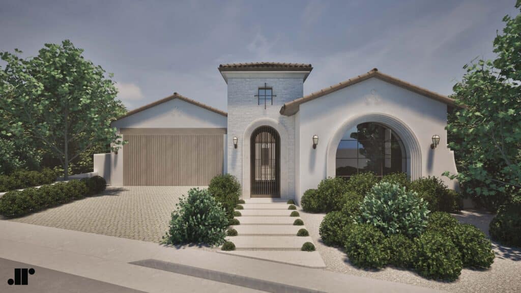The striking exterior showcases a refined fusion of clean lines, arched windows, and rich natural textures. A grand stone-clad entryway, accented by a custom wood door, sets an impressive tone, while the sleek, dark-framed windows and wrought-iron balconies add a touch of modern elegance.